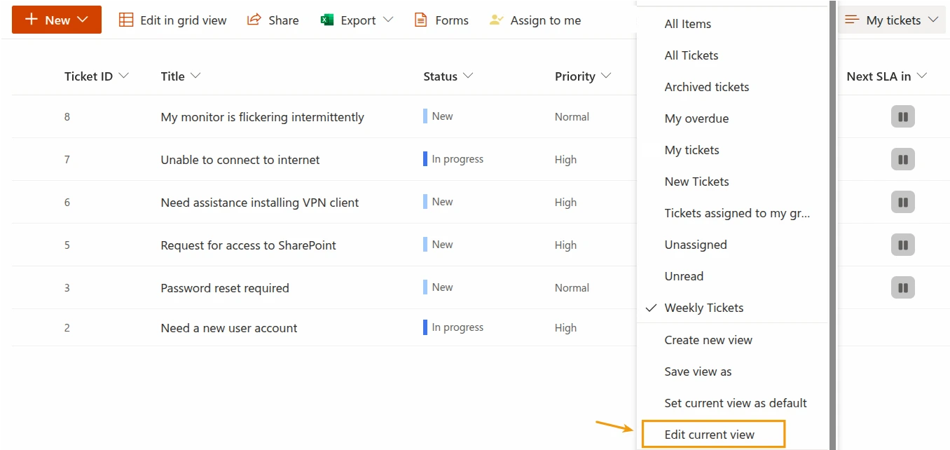 Once the view is created, you can edit its content and apply filters to show only the necessary and relevant tickets.