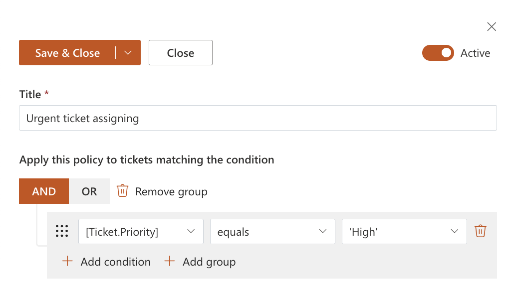 Next, create another SLA policy with a condition that applies only when the ticket priority is High.