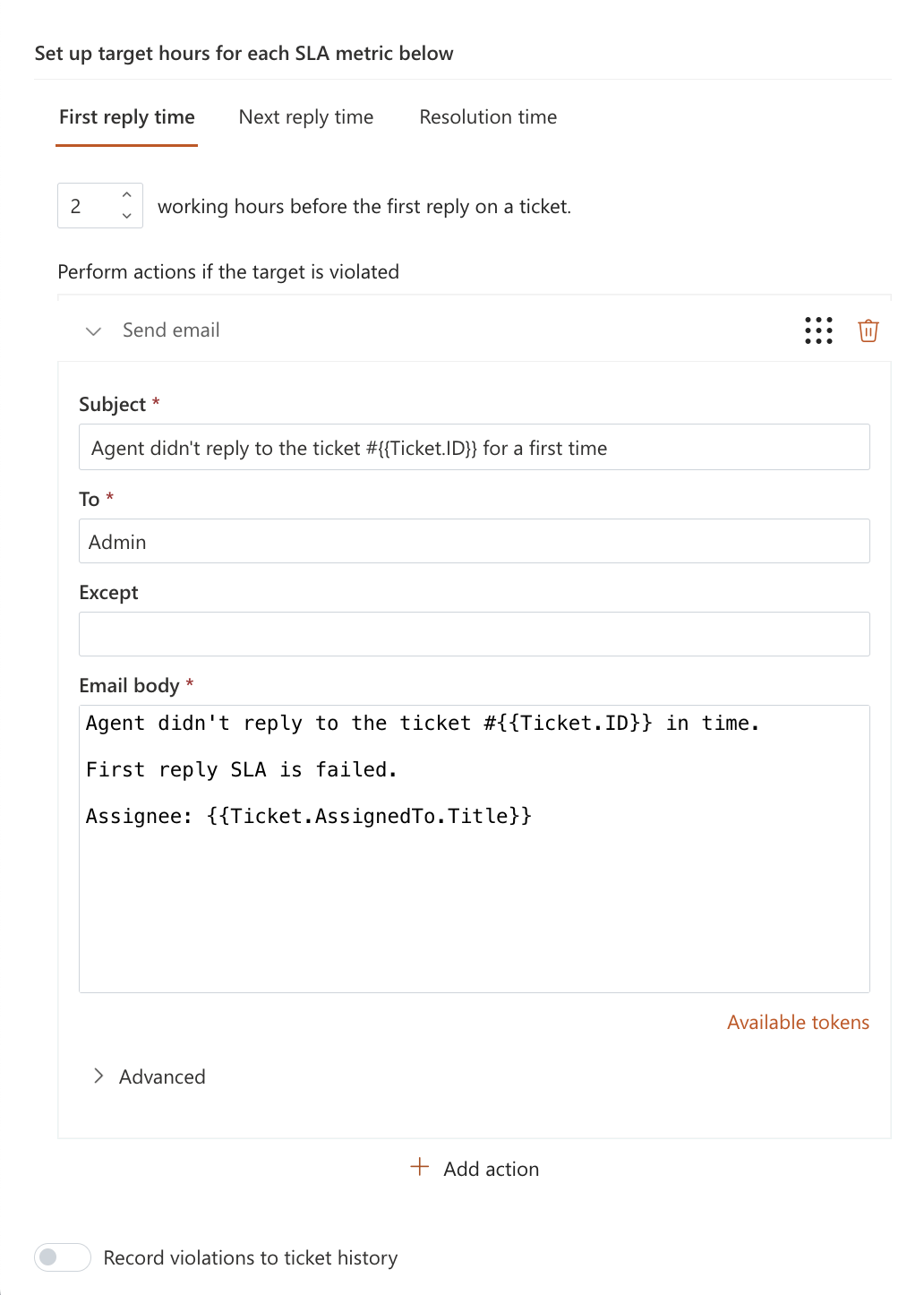 For high-priority tickets, set a target time of 2 working hours. If this target is not met, an administrator is notified.